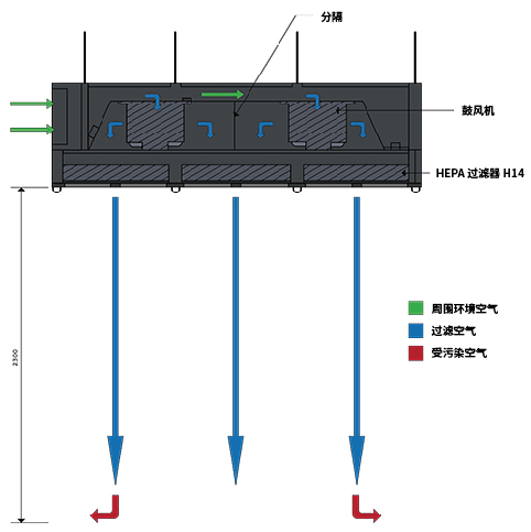 层流罩是一种垂直单相层流、提供局部百级无尘无菌环境的净化设备。层流罩提供经高效过滤器过滤的单向气流,为无菌制备提供ISO5洁净度空气质量。层流罩广泛应用于制药、化妆品、食品等需要洁净环境保证生产质量的行业。层流罩能在B级或C级洁净环境下创造A级区域,相比直接搭建A级洁净室,更加灵活、快速且能降低成本。